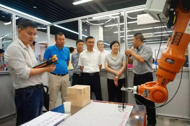在“国化智能”机器人实验室,国化智能工程师陈诗银操作KUKA机器人,为何静彦主席一行演示“机器人书法”。国化智能在智能制造2025大潮下,积极的发展机器人集成业务,成立两年,年产值已突破5000万。亮眼的成绩受到何静彦主席的肯定。